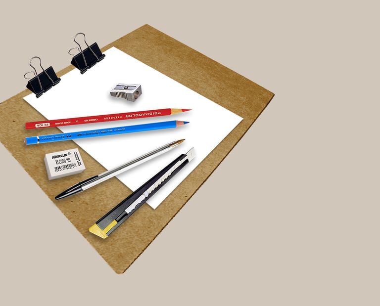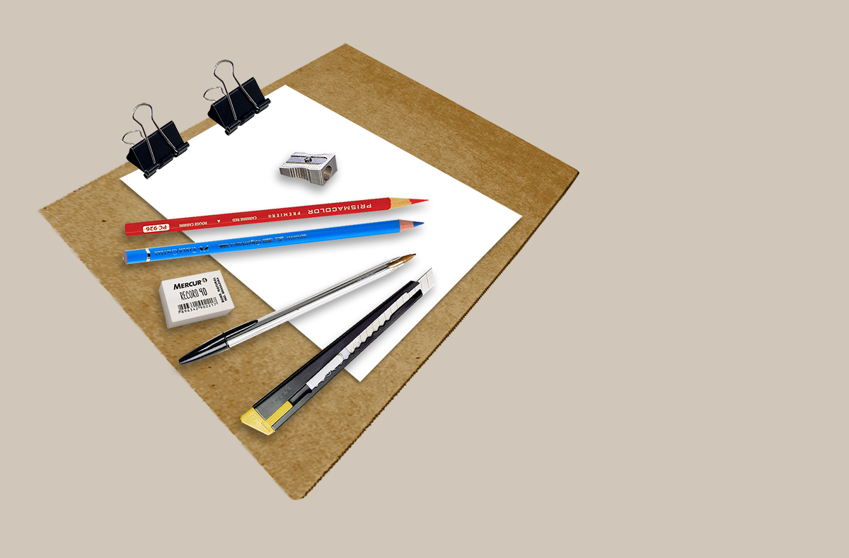 Presilhas, Papel A4, (Lápis azul e/ou Lápis vermelho- opcional), Borracha branca, Lápis nº 2 ou lapiseira 0.5mm e/ou 0.9mm, Apontador ou estilete, Prancheta 50 x 40 cm(opcional), Caneta Bic preta ou a Nanquim.
