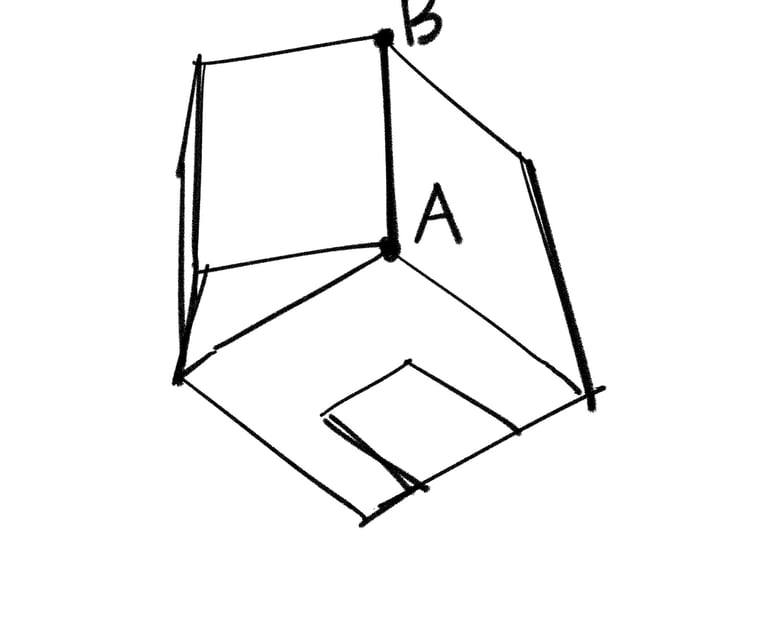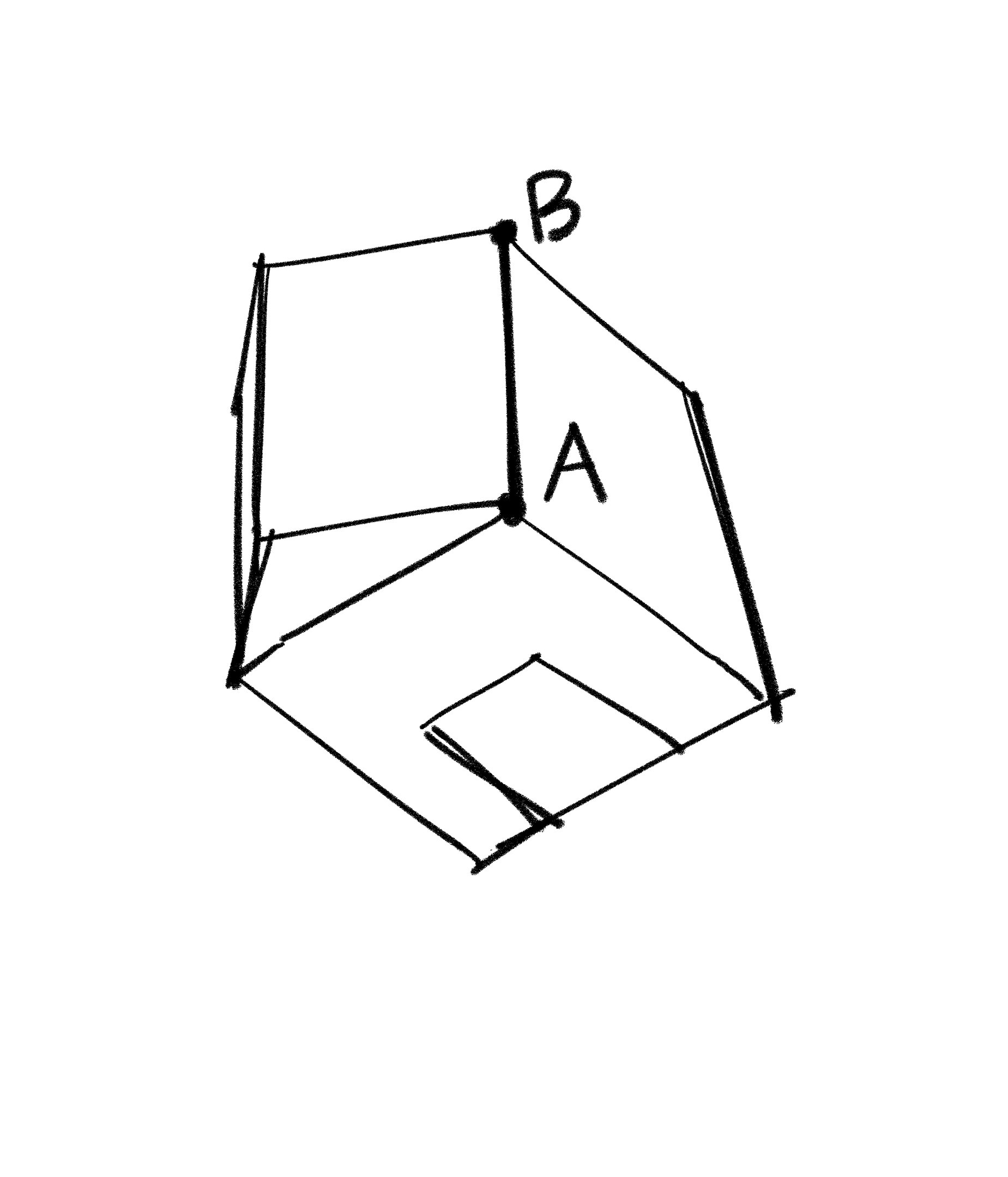 Como por exemplo no desenho abaixo, se eu vou do ponto A ao ponto B, em relação ao papel eu estou deslocando o lápis verticalmente, mas para o objeto(relação “Objeto->Objeto”) que estou desenhando, o lápis está indo no sentido da profundidade. Portanto, neste exemplo, foi importante adotarmos um referencial relativo ao objeto desenhado e não mais relativo ao plano do papel(Relação: “Objeto->Espaço”).