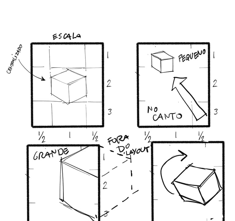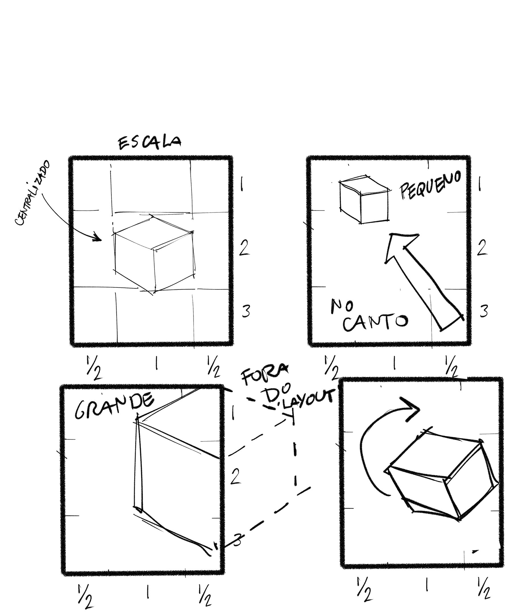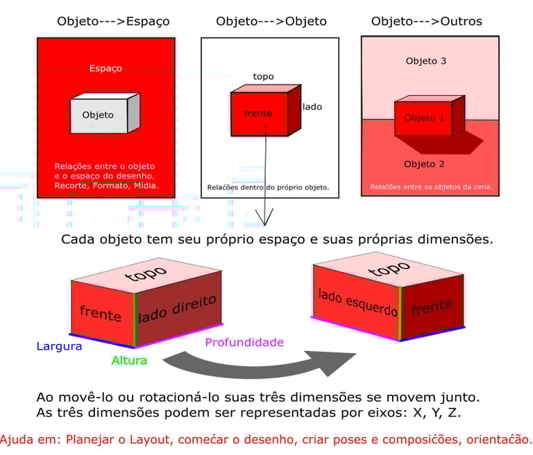 A relação OBJETO->ESPAÇO diz respeito à posição, escala e orientação do objeto dentro da área de composição, ou seja, dentro do formato; e faz parte da construção de “layouts” e cenas.