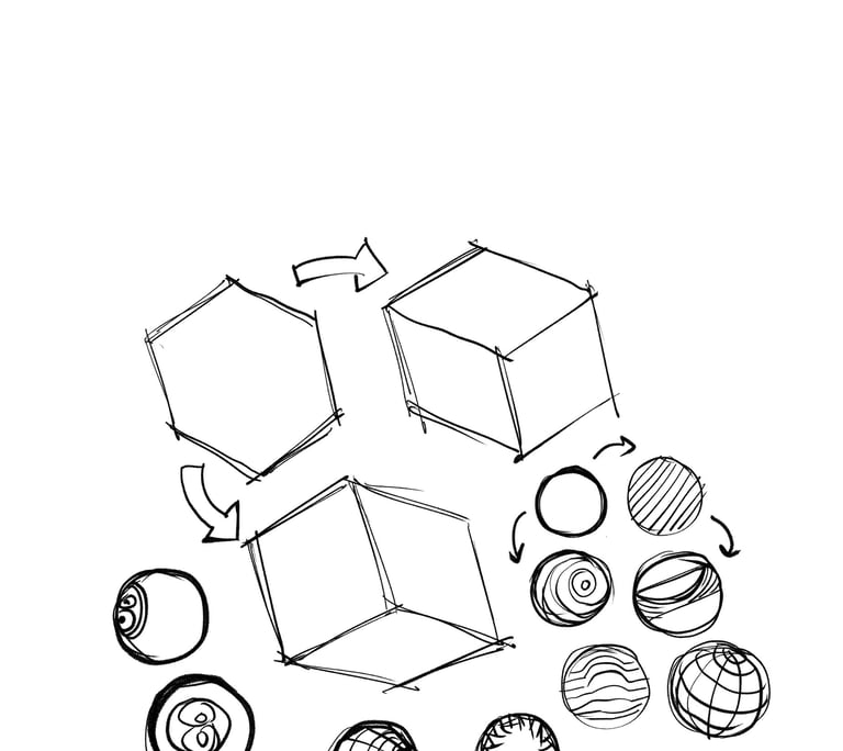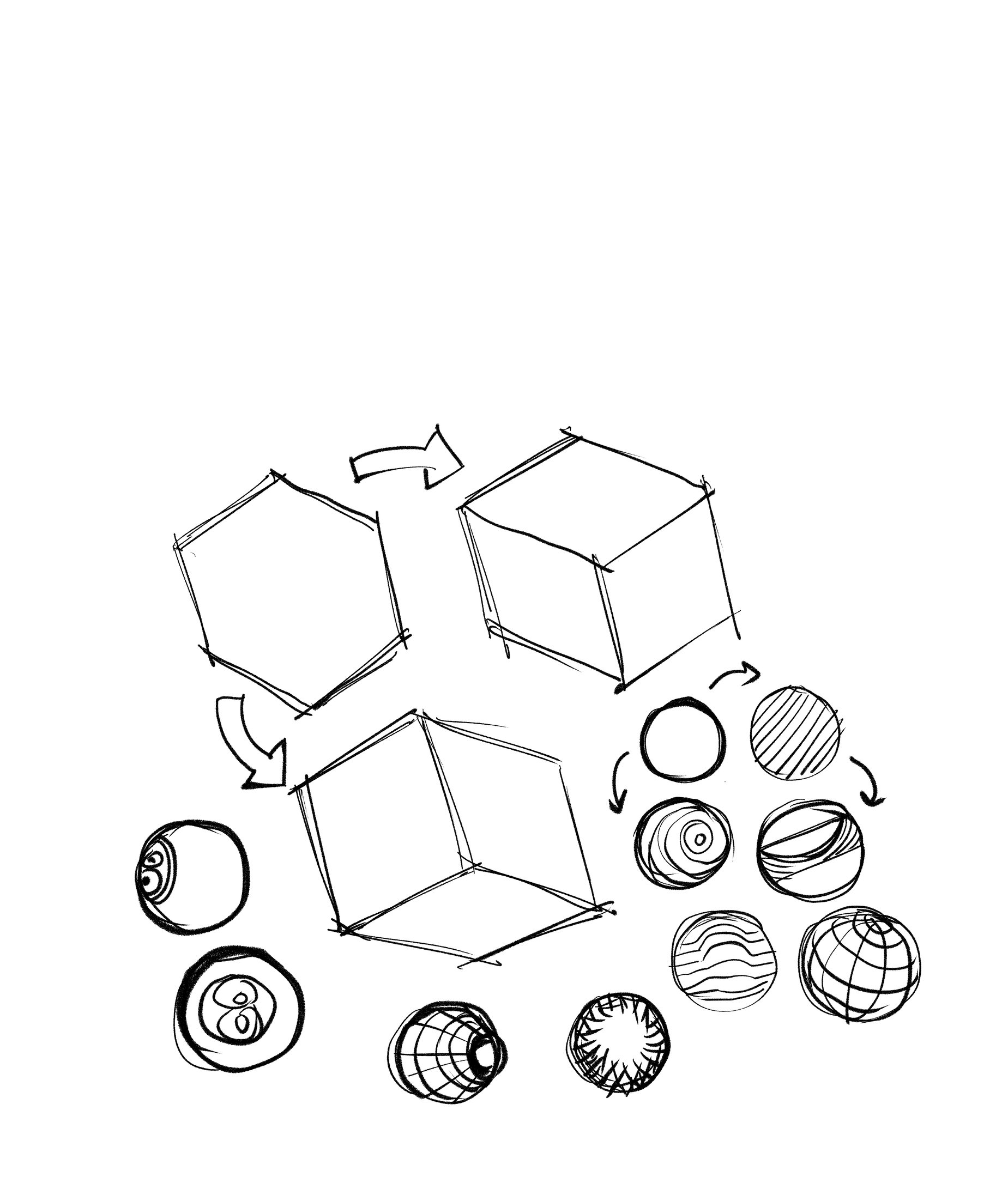 A relação OBJETO->OBJETO é tudo que altera a compreensão do próprio objeto. É tudo que está codificado dentro da silhueta/contorno/área do objeto. É fundamental para a orientação e percepção do volume e profundidade do mesmo . Veja nos exemplos abaixo, que as diferentes informações codificadas em cada objeto resultam em objetos totalmente diferentes, ainda que as silhuetas sejam as mesmas.
