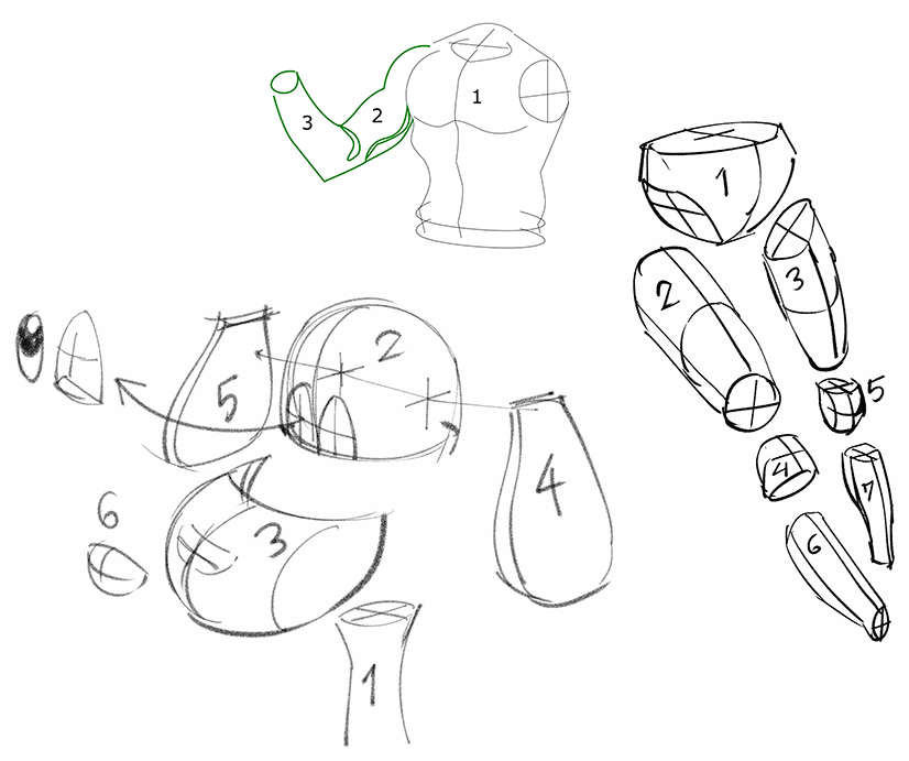 Então, além de separar os objetos por partes, é importante compreender a ordem de criação dos mesmos. Essa observação serve para ajudar na composição de poses nos desenhos de pessoas, animais, máquinas etc. Quando seguimos uma hierarquia fica mais fácil construir objetos mais complexos, poses, composições e cenas.