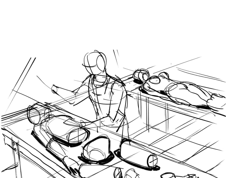 Você pode utilizar o lápis ou até mesmo fazer uma mancha com um dedo sujo de carvão, etc. Esse procedimento vai ajudar a estudar o “Layout”/composição/gestual/pose/”peso” dos objetos a serem desenhados observando as relações OBJETO->ESPAÇO, OBJETO->OUTROS OBJETOS, OBJETO->OBJETO e HIERARQUIA.