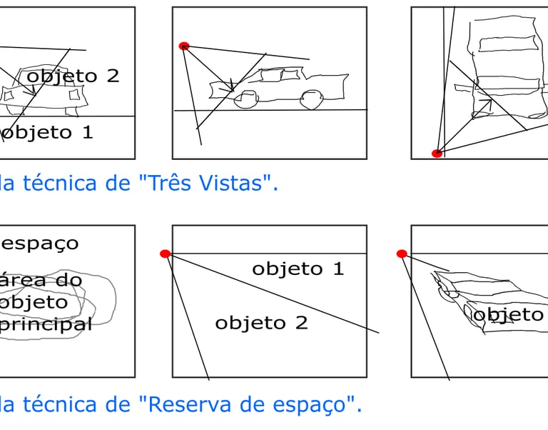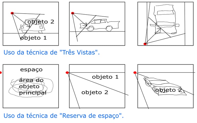 Após montar um rascunho da composição que satisfaz às perguntas, focamos nas “Relações do objeto”. Esse conhecimento foca em posicionar e rascunhar um objeto de cada vez. Agora já se começa a avaliar a estrutura da cena e dos objetos e já é possível ir entendendo como ficará o desenho final.